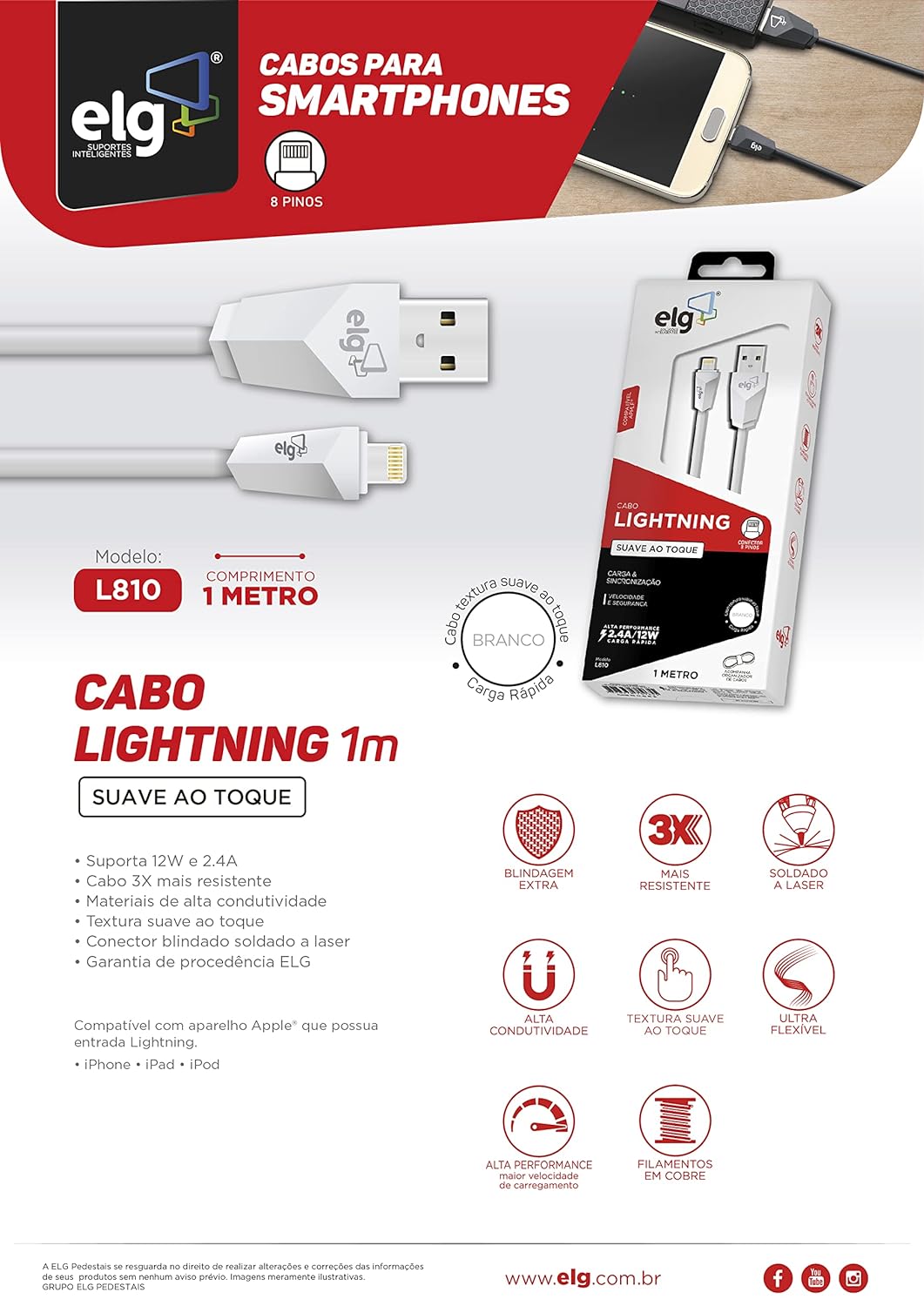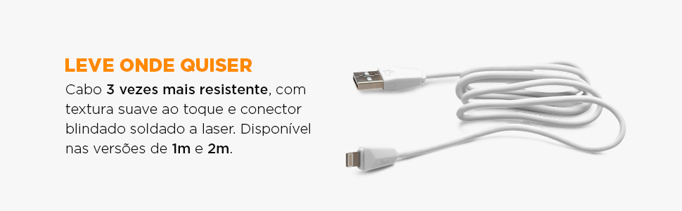 O cabo lightning 8 pinos possui conectores metálicos e cabo flat (perfil slim) de 1 ou 2 metros em tecido reforçado de nylon trançado. Seu perfil achatado, evita que o cabo fique emaranhado facilmente, auxiliando na organização e resistência nas flexões constantes. Possui acabamento em diversas cores e design com visual mais elegante e refinado. Os conectores em alumínio garantem maior segurança e durabilidade.